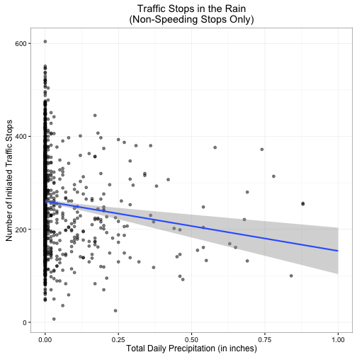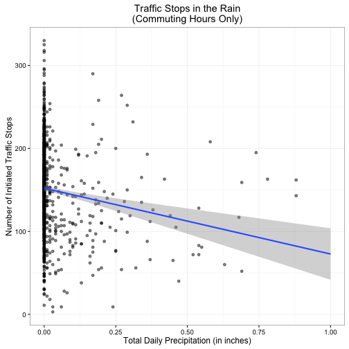 Open and shut case, right? Well, not quite. If the police don’t want to stop vehicles in the rain, it also stands to reason that drivers don’t want to make trips in the rain if they can avoid it. By staying off the roads, there will be fewer potential cars for the police to stop. Any decline in stops associated with precipitation may not be the fault of the police, but instead the public.